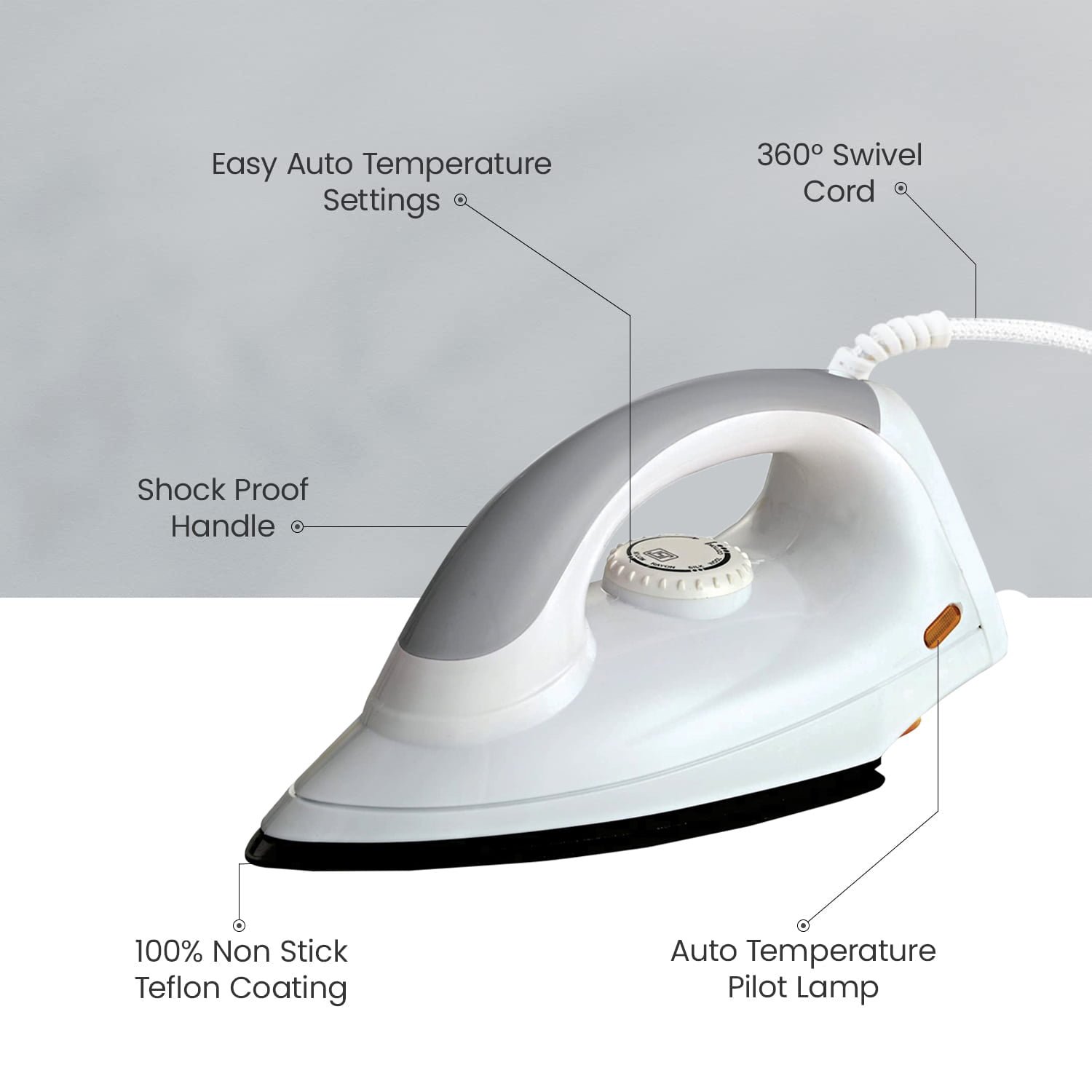 German grade non-stick coated sole plate Cast In Sole Plate, Technology for Faster and Uniform Heating, Shock Proof Plastic Body Thermostat for Variable Temperature Control, Thermal Fuse For Over Heat Safety Protection, Silk Braided, Power Cord with Stress Reliever & Twist Reliever, Cool Touch Body with Comfortable, Handle Grip, Super Clean Surface Finish with Pleasant Aesthetics, Button Groove reaches Into Tricky Areas Cord Winder Facility, power 750 watts, Power Indicator.